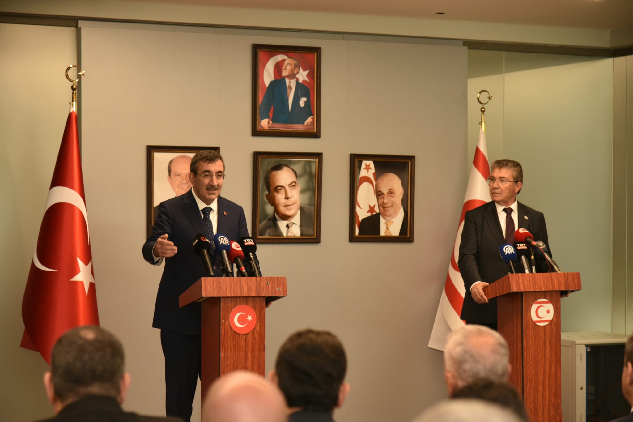 TC Cumhurbaşkanı Yardımcısı Cevdet Yılmaz ve Başbakan Ünal Üstel, Ercan Havalimanı’nda basın toplantısı düzenledi. Yılmaz, ziyaretin, 2025 yılı İktisadi ve Mali İşbirliği Anlaşması çerçevesinde ekonomik, mali ve ticari ilişkileri ve Kıbrıs Türklerinin hayatını kolaylaştıracak ve refahını artıracak çalışmaları ele almak için bir fırsat teşkil ettiğini dile getirdi.