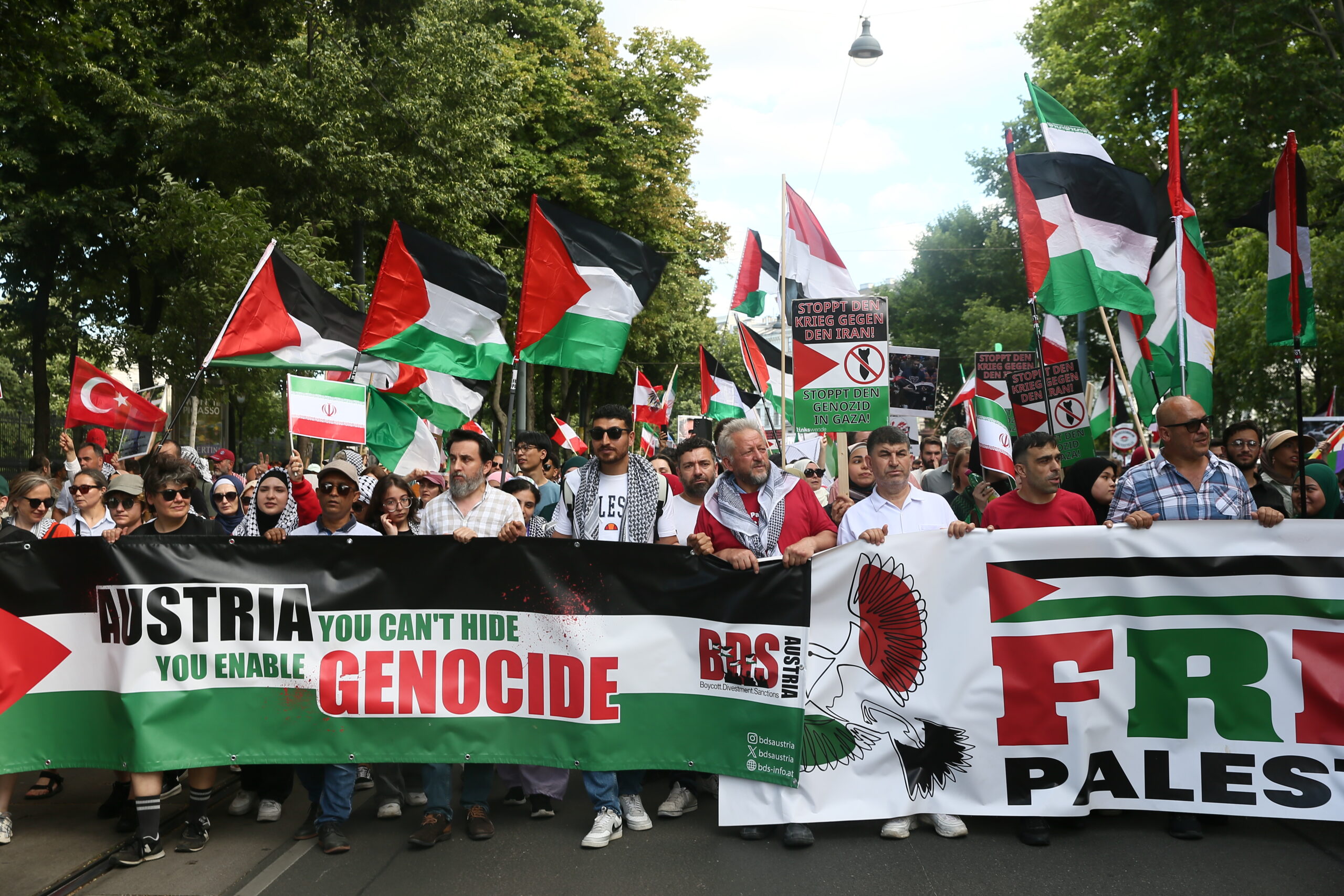 Filistin’e destek gösterisine katılan yüzlerce kişi önce Avusturya Parlamentosu’na ardından Başbakanlığa yürüdü. Göstericiler, “Özgür Filistin”, “Gazze’deki soykırımı durdurun”, “Gazze’deki çocuklar da yaşamak istiyor, Avusturya ise buna karşı çıkıyor”, “Netanyahu yakalanacak, çocuk katili hapse girecek” sloganları attı.