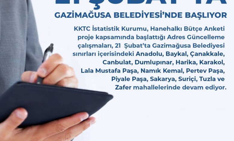 İstatistik Kurumu’ndan yapılan açıklamaya göre Kurum’un Hanehalkı Bütçe Anketi projesi kapsamında başlattığı adres güncelleme çalışmaları, yarın Gazimağusa Belediyesi sınırları içerisinde devam edecek.