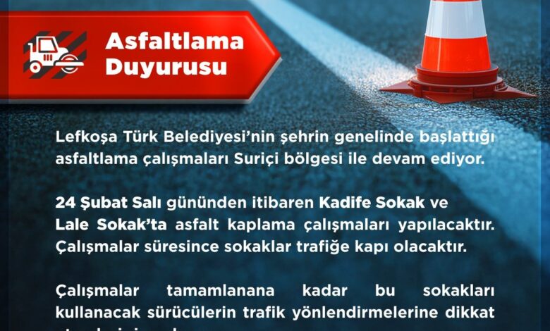 Lefkoşa Türk Belediyesi, şehir genelinde yürüttüğü asfaltlama çalışmalarını Suriçi bölgesinde sürdürüyor. Belediyeden alınan bilgilere göre, yarından itibaren Kadife Sokak ve Lale Sokak’ta asfalt kaplama işleri gerçekleştirilecek. Bu süre zarfında sokaklar trafiğe kapatılacak ve sürücülerin trafik yönlendirmelerine dikkat etmeleri önemle rica ediliyor. Ahbap Gazetesi olarak, Lefkoşa’daki gelişmeleri okuyucularımızla paylaşmaya devam edeceğiz.
