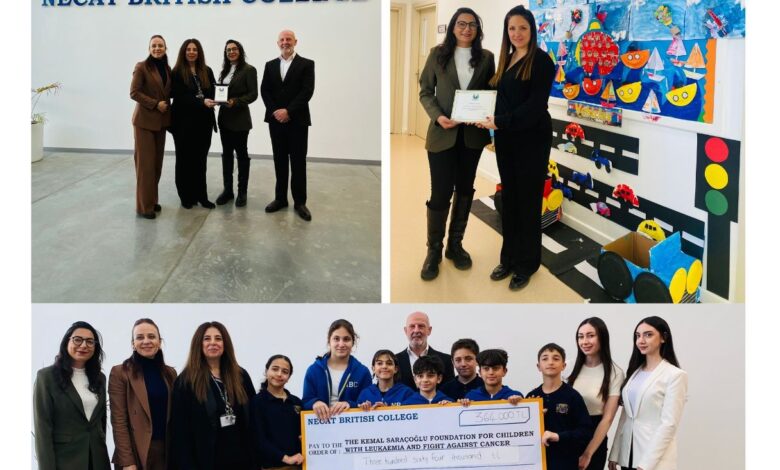 Necat British College’ın Lefkoşa ve Alsancak kampüsleri ile Pre-School birimi, Kemal Saraçoğlu Lösemili Çocuklar ve Kanserle Savaş Vakfı yararına düzenledikleri etkinlikler ve kermesler sayesinde toplam 407 bin TL bağış topladı. Toplanan bu bağış, vakıf yetkililerine takdim edilirken, teşekkürü de beraberinde getirdi. Kemal Saraçoğlu Vakfı, Necat British College yöneticileri, öğrencileri, öğretmenleri ve velilerine verdikleri destekten ötürü plaket sundu.