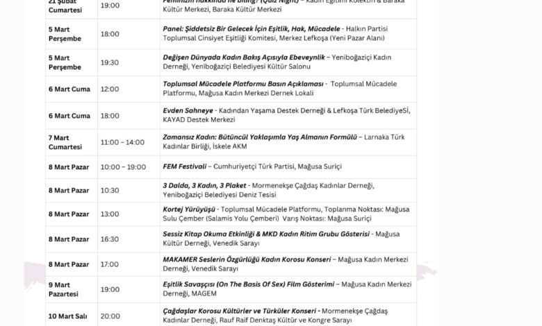Özellikle 8 Mart günü, Gazimağusa’da festival havasında geçecek. Mağusa Suriçi’nde gün boyu etkinlikler düzenlenirken, geleneksel kortej yürüyüşü Sulu Çember’den Suriçi’ne uzanacak. Venedik Sarayı’ndaki sessiz kitap okuma etkinliği, kadın ritim grubu gösterisi ve MAKAMER Kadın Korosu konseri, günün öne çıkan etkinliklerinden.